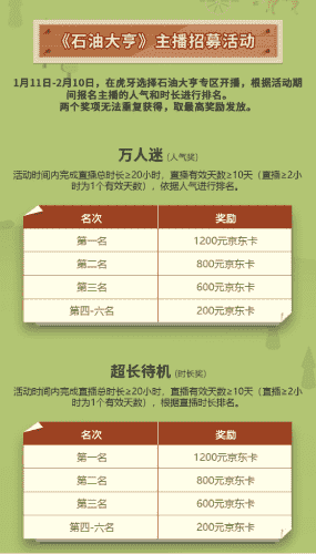 除了“油王”争霸赛,,精英主播招募活动亦同步开启!!!赛事分时长奖和人气奖,,奖励同样丰厚!!